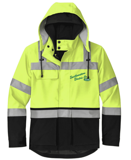 100% polyester 300-denier ripstop shell with durable water-repellent (DWR) finish 100% polyester lining Black bottom front and lower sleeves for a cleaner appearance Shell’s fabric waterproof rating: 5000MM Fully seam-sealed shell Adjustable rain hood Durable reflective 2-inch tape meets ANSI 107 requirements Full-length interior and exterior storm flaps Vented cape back Right chest pocket and retractable ID holder Two lower front pockets Center front zippered pocket to hold a tablet Gusseted cuffs Elastic hemDecoration access pocket in shell Non-ANSI 8.6-ounce 100% polyester inner full-zip hoodie Hoodie can be attached inside shell This garment must be fully zipped to be in compliance with ANSI 107 standards