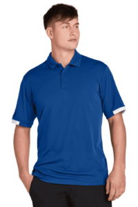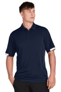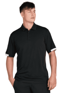 4.4-ounce 100% recycled polyester interlock with PosiCharge technology body 4.1-ounce 100% recycled polyester ultra-fine flat back mesh with PosiCharge technology Carbon footprint neutralized through the ClimeCo Certified Product Program Moisture-wicking Odor-resistant Self-fabric collar Self-fabric neck tape Mesh back panel under arm inserts and colorblocked mesh sleeve insets 3-button placket Dyed-to-match buttons Forward shoulder seams Tear-away labelA C-FREE Product**